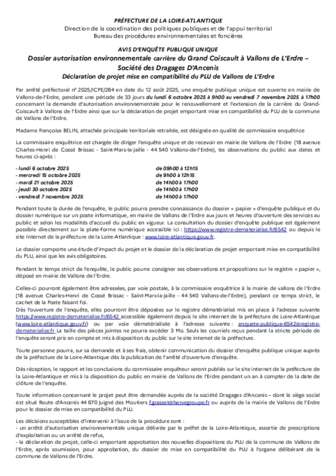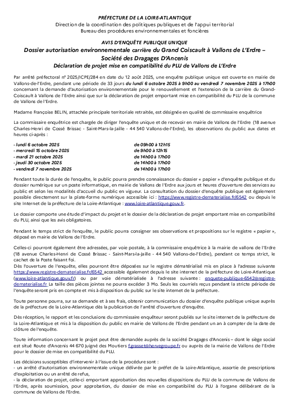 Avis d'ouverture d’une enquête publique unique prévue du lundi 6 octobre 2025 à 9h00 au vendredi 7 novembre 2025 à 17h00 sur la demande formulée par la Société Dragages d’Ancenis en vue du renouvellement et l’extension de la carrière du Grand Coiscault sur la commune de Vallons de l’Erdre, ainsi que sur la déclaration de projet emportant mise en compatibilité du PLU de Vallons de l’Erdre.